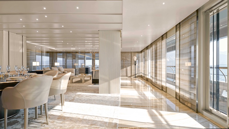Instead of starting with looks, the design began with space. At 2,104GT, the yacht offers unusually large interiors for her size. Corridors feel wide, guest cabins are bright thanks to large windows, and the owner’s suite on the upper deck covers around 180 square metres with its own private terrace. Throughout the yacht, furniture is kept minimal. Open space is part of the design, not something left over.